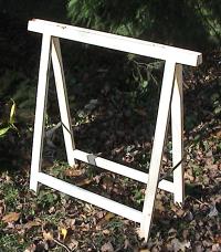 Klappbare stabile Holzböcke mit zwei Scharnieren und zwei Haltescheren, Ecken und Kanten gerundet.